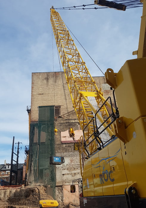 The Crawler cranes move on treads which allow them to pass through unpaved areas and challenging landscapes. With their pick and carry capability, they can handle weights up to 80 tons and the offset jib allows for long radius and tall building work. Using crawler cranes is more cost-effective than a mobile crane with better lifting capacity.